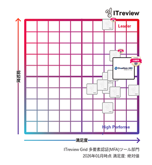 CloudGate UNOは、IT製品レビュープラットフォーム「ITreview」で顧客満足度と製品認知度ともに優れた製品であると評価され、「ITreview Grid Award 2026 Winter」のシングルサインオン(SSO)部門およびID管理部門、多要素認証(MFA)部門の3部門で「Leader」を受賞しました。3部門の受賞は19期連続となります。なお、SSO部門およびID管理部門は「ITreview Grid Award 2020 Spring」から24期連続の受賞となります。