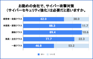 「勤めている会社で、サイバー攻撃対策は必要だと思う」と回答した人は全体の70.1%にのぼる一方で、一般クラスのみでは46.8%と半数以下になっており、サイバーセキュリティマインドが浸透していないという結果になったとのことです。